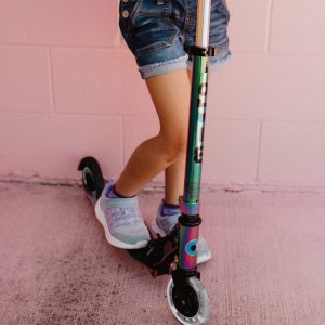Take classic and sleek design to the next level with the Micro Cruiser LED Neochrome! Children can get their kicks on one of our coolest rides, and the perfect 2-wheeled scooter for ages 6+. This upgraded Cruiser features a neochrome finish and motion-activated light-up LED wheels on the front and back, adding some bla