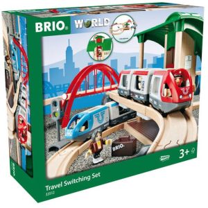Connect from one train to another with the 42-piece 33512 Travel Switching Set. Jump on board the blue line’s battery-powered train and ride the rails over the bridge and onwards to the modern Switching Station. Take the lift between platforms by using the crank and switch over to the red line where the passenger train