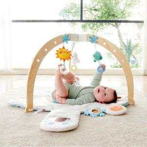 Explore sensory delights with our activity gym. It boasts a soft mirror and customizable cards for budding learners. Additionally, cherish the tummy bear pillow, interactive hanging toys, and crinkly features for comprehensive playtime happiness. Item Weight: 4.85 lbs Product Dimensions (L x W x H): 28.7 x 20.8 x 34.25