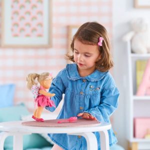 Mini Corolline Rosy is a petite doll ready to offer for any gift-giving occasion, with an all-vinyl body that is delicately scented with vanilla, a Corolle signature. Rosy has blue painted eyes and silky blonde hair. She's dressed in a pink-and-white gingham dress with a Peter Pan collar over underpants and matching mo