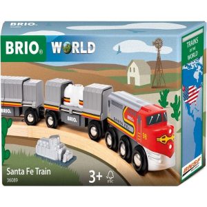Hop aboard the Santa Fe Train! With its iconic “Warbonnet” livery, this wooden streamliner brings US railway history to your BRIO World. Ride one of the largest US railways on board the Santa Fe Train – part of the Trains of the World series. This wooden streamliner includes the iconic engine, two cargo wagons and two