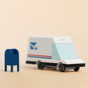 Our Mail Van 2.0 is here: It may look like an odd bird, but it has increased cargo capacity, and likely electric propulsion – all wrapped in a red-white-and-blue livery.  Tiny package delivery ON TIME! Materials: Solid Beech Wood, water-based paint and clear urethane coat. ABS plastic rims, with plastic tires. Ages 3+