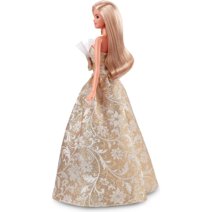 The 2025 Barbie Holiday Doll is ready to embrace the delights of the season in style. She’s dressed for festive revelry in a voluminous gown with a silver and golden brocade pattern – an homage to holiday décor. The dress is packed with glamorous details, including a dramatic tulle-accented neckline and an oversized bo