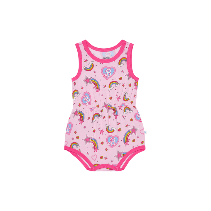 Sporty spice and everything nice in this fun little summer romper. Sleeveless detail & short leg opening with contrast binding, crew neckline, and a delicate elasticated gather at the waist. Snap closure at crotch for easy diaper changes. A Posh Peanut classic design! Sleeveless with scoop neckline and contrast tri