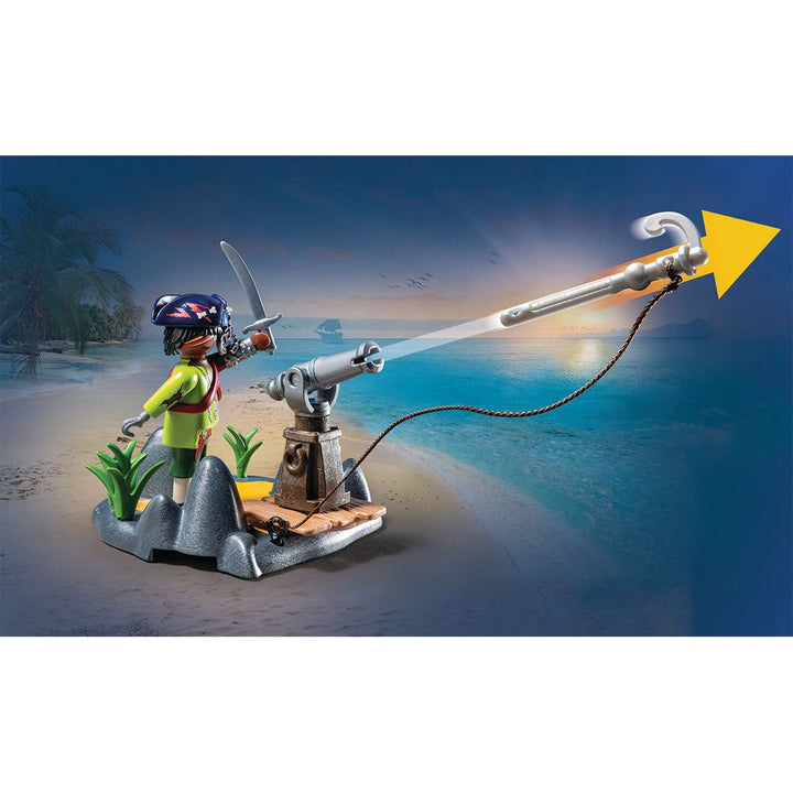 It's eight giant crab legs versus two pirate legs at the Battle of the Giant Crab! Who will win? The pirate faces the enormous crab armed with his grappling hook cannon. However, the crab quickly grabs the pirate with its mighty claw and tosses him into the sea. With imaginative characters, fantastic features, and cree