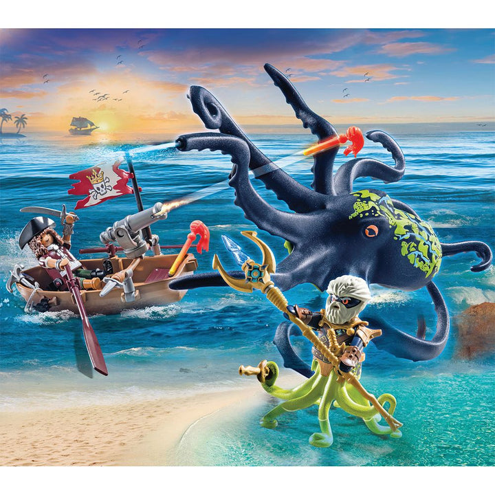 It's eight giant octopuses legs versus two pirate legs at the Battle of the Giant Octopus! Who will win? Watch as the sea monster splashes real water from its tentacles as the pirate tries to escape in his rowboat with functioning cannons. The boat floats and fits one figure inside. Combine with other PLAYMOBIL Pirate