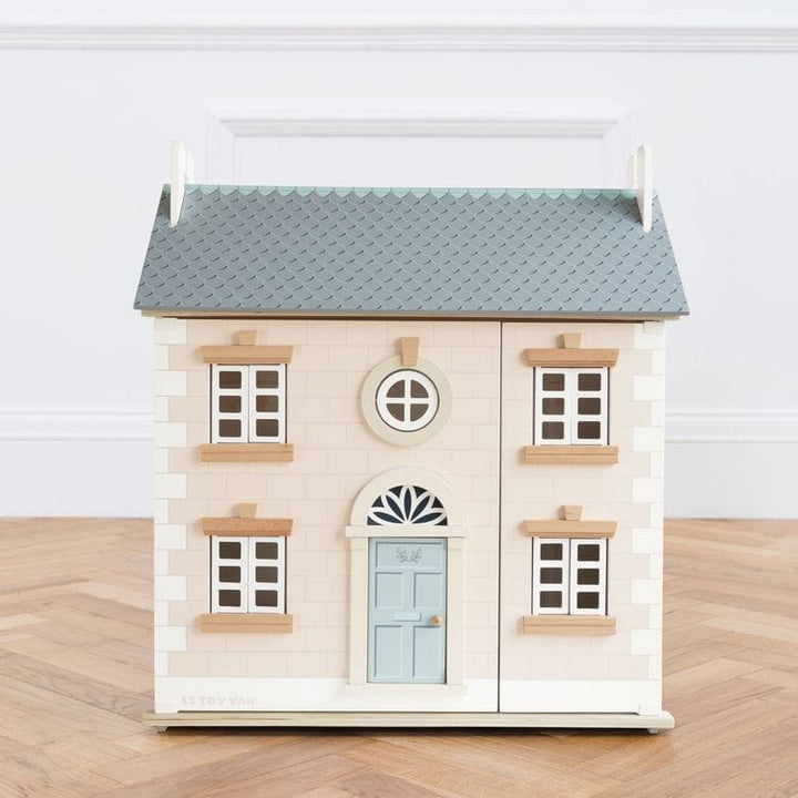 A fully painted and decorated large 3 storey doll house with a beautiful circular window. It includes the staircase and opening windows and door. Dolls and furniture sold separately.  Ages 3 yrs + Material: 70% MDF, 20% Plywood, 8% Teawood, 2% Stainless Steel This product is a toy. Remove all packaging and keep for fu