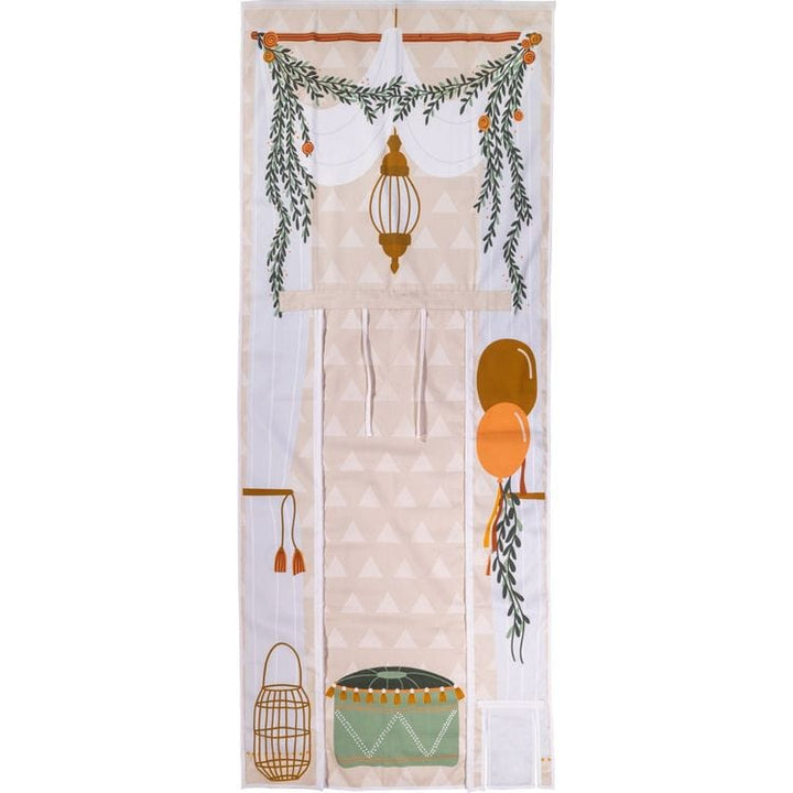The Boho Tea House Storefront is the perfect spot to gather with friends for a tea party they won't forget. This imaginative play shop is made from machine-washable poly-cotton canvas, is easy to hang, and takes up almost no space to inspire hours of creative play. Printed on both sides with two different shop scenesÂ