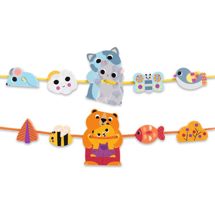 Children have fun threading the beads and lacing the boards on the two cords by matching parents to their children. Perfect for little ones aged 2 and over as they begin to learn. Children lace the boards and thread the beads: 2 complementary actions. Helps develop children’s fine motor skills. The ends of the cords ar
