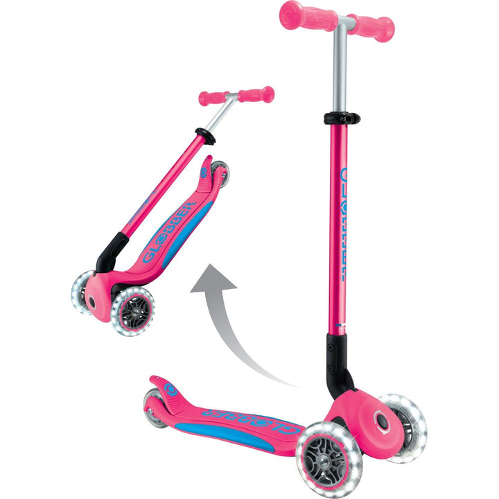 The most accessible Globber scooter—from price point to features—ELITE LIGHTS delivers the best value for your scooting kiddo. A 3-wheel scooter equipped with LED light-up wheels, a patented folding system, a 4-height adjustable T-bar, and a patented steering lock system, ELITE LIGHTS is packed with all the features yo