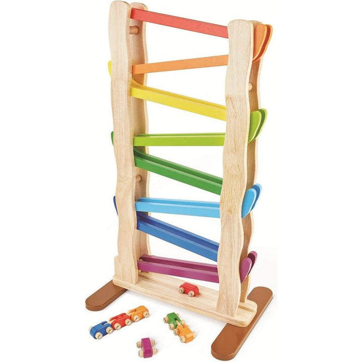 Watch your race cars flip over one another as they come racing down! Make Fast Flip Racetrack a part of your playroom race course. Which of the Race Cars do you think is the fastest Race them all and record the results! Ages 3+ Materials: WOOD, Steel Care instructions: Wipe with damp cloth, air dry; do not immerse in w