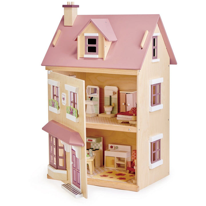 Foxtail Villa is the perfect town-style dolls house. The subtle colours and top-quality FSC plywood fascia make this a beautiful mid-size dolls house for any little boy or girl, with a clever design to lift and hold the roof to access the attic. Included is a starter set of matching furniture: A cooker, sink unit, tab