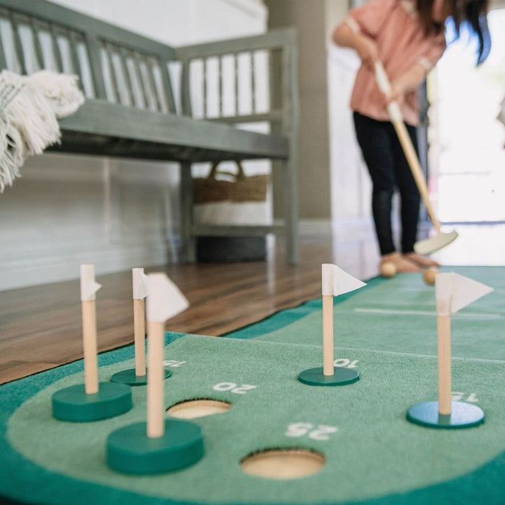 Practice the perfect putt with our Keen Putting Green! Every little tiger will love our practice putting green which overlooks a resplendent view of the mountains and sunshine (etched into a plywood backboard). Comes complete with 5 flags on wooden bases that fit into holes with printed scores, an adjustable height g