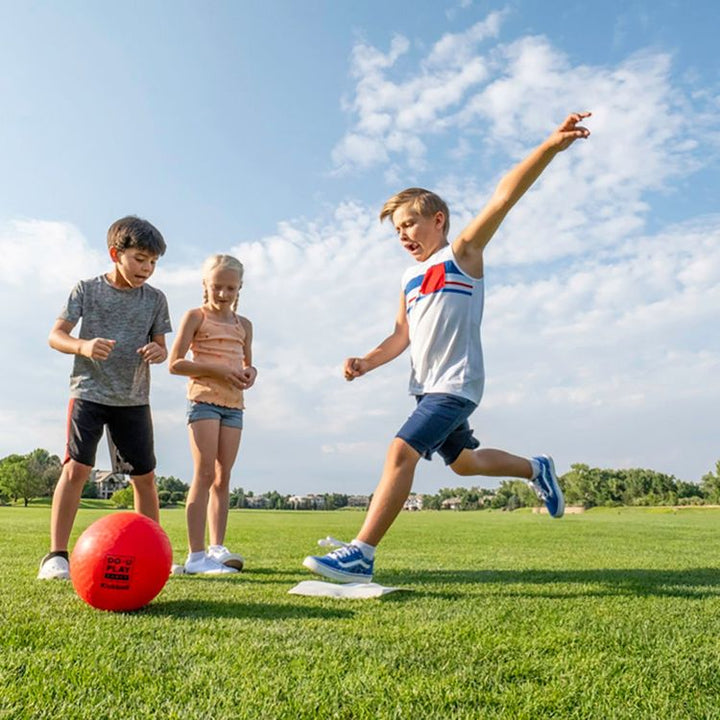 The Kickball Kit by Do U Play Games is perfect for children aged 3 and up, offering a variety of outdoor games such as kickball, soccer, and volleyball. It includes a durable rubber kickball, four sturdy plastic bases, a pump with a needle protector, and a carrying bag. The kit is designed to encourage physical activit