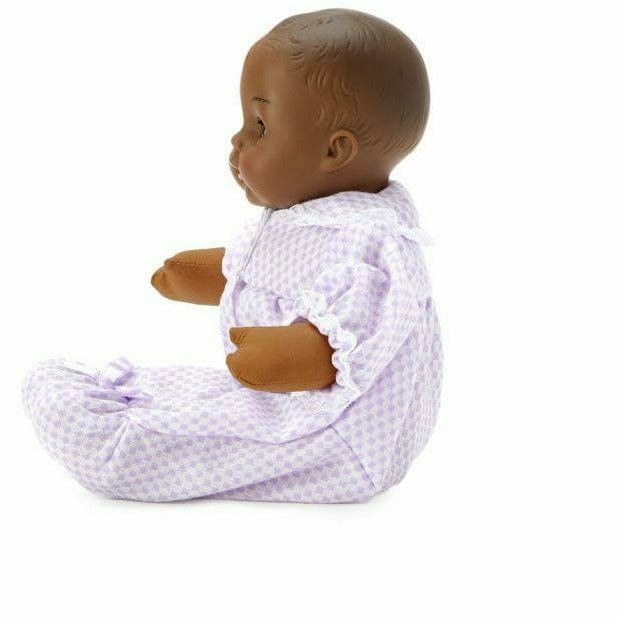 This beautiful 12" baby doll with brown eyes and brown painted hair wears a lavender and white checked knit onesie. The onesie has a yoke, gathered body, long sleeves, footed feet and a Peter Pan collar. Lavender ribbon on the front and lace trim at the wrists and on the edge of the collar complete this baby's outfit.