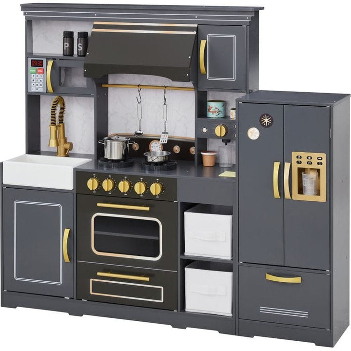 Fuel culinary dreams with Little Chef Colonie Play Kitchen! Featuring trendy dark gray cabinets with gold hardware, a modern farmhouse sink, and built-in microwave and coffee maker for realistic pretend play. Toddlers will love the fun details like the clicking oven knobs, magnetic side-by-side fridge with ice dispense
