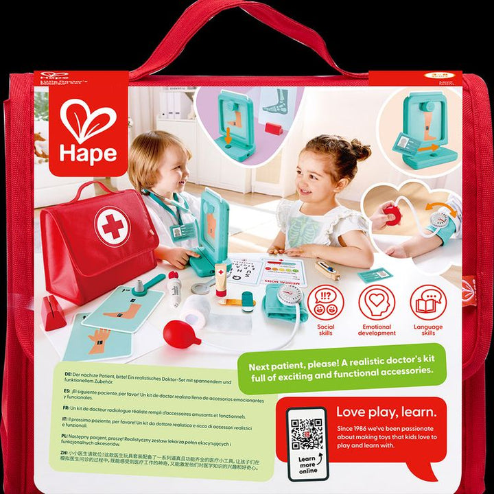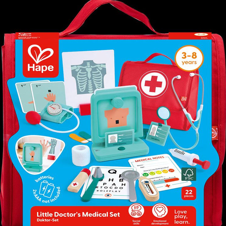 Get ready for hours of imaginative play with the Hape Little Doctor's Medical Set! This fun and interactive set includes all the essentials for budding young doctors, such as a stethoscope, syringe, thermometer, and medicine bottles—all stored in a handy fabric doctor’s bag. Whether checking a patient’s heartbeat, givi