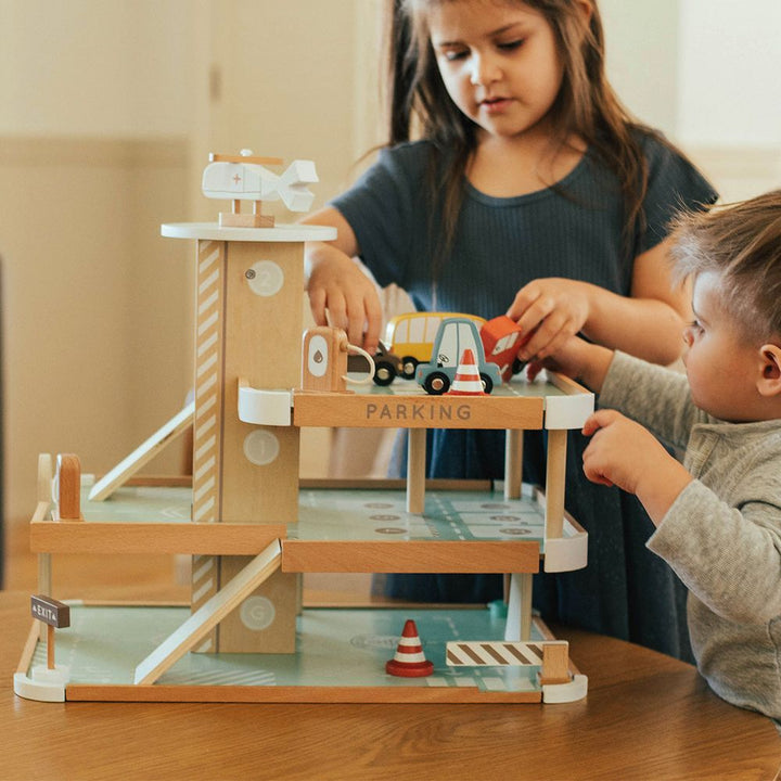 Your little tot will drive into fun with our Little Tot Parking Lot. Our quality wooden parking lot has 3 floors of imaginary play including ramps, helipad and helicopter, 3-floor crank elevator, 4 motor vehicles, safety cones, signs, gas pump and charging station, and more! Simple assembly, and you’re ready to go.Â