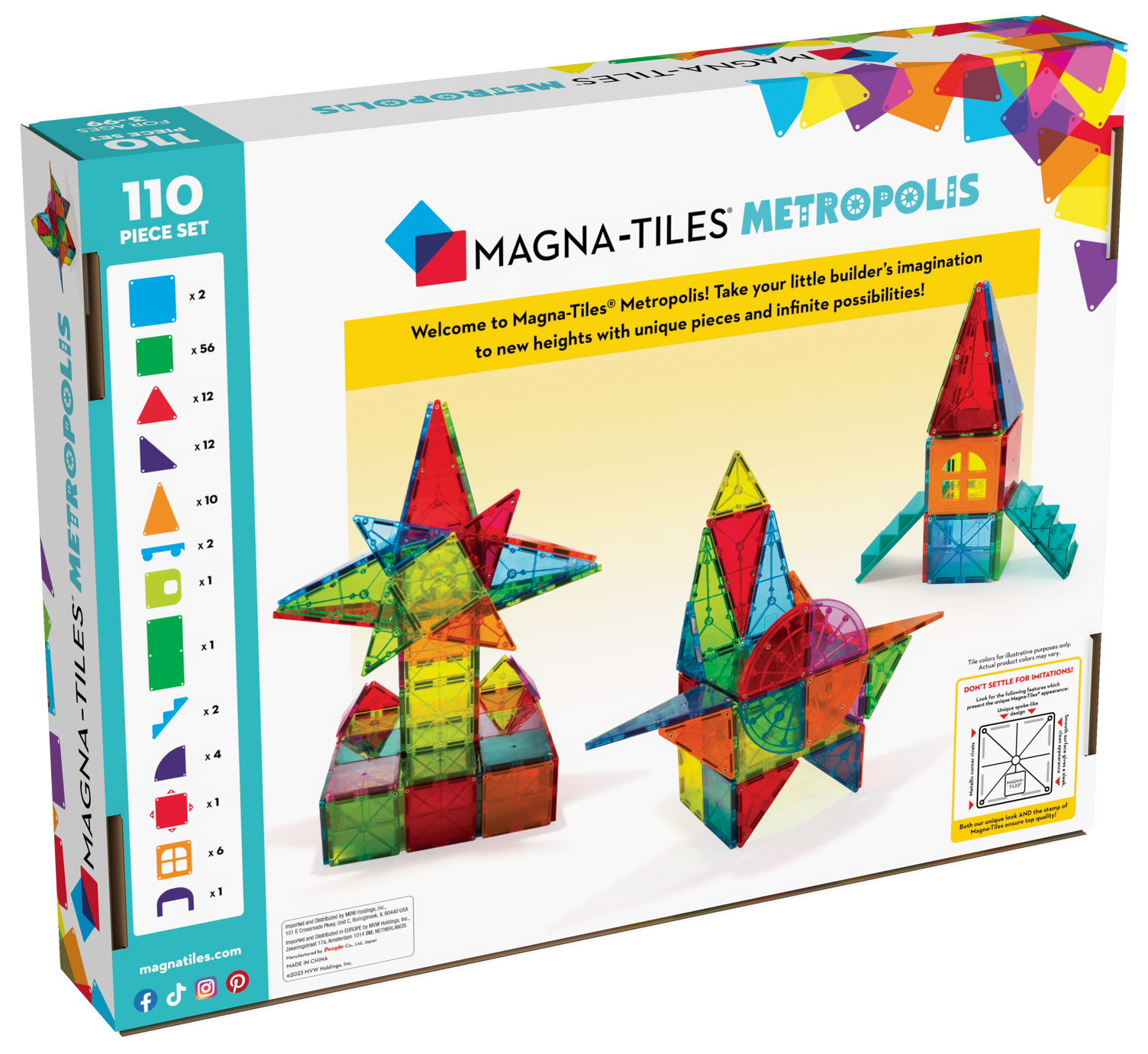 The secret is out: Anything kids can dream. they can create with the MAGNA-TILES® Metropolis 110-Piece Set! Sure to spark hours of meaningful play. this set is not only our largest yet… it also includes vivid colors and unique pieces. allowing children to build anything from a high-rise city skyline to a bustling colony in outer space. Designed for kids ages 3+. this set checks all the boxes that make learning fun. encouraging the understanding of: basic geometric concepts. color theory. STEAM skills. teamwork. problem-solving. and more. It’s why MAGNA-TILES® sets are go-to choice for playrooms and classrooms across the world!