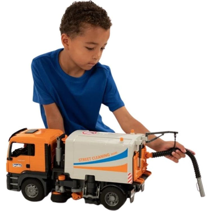 Street cleaners are an indispensable helper for every city administration and are part of the everyday cityscape. No other vehicle ensures clean streets and sidewalks as efficiently. The street cleaner from Bruder shows in great detail how this exciting truck works. The Man TGS is the perfect partner. Robustly built, e
