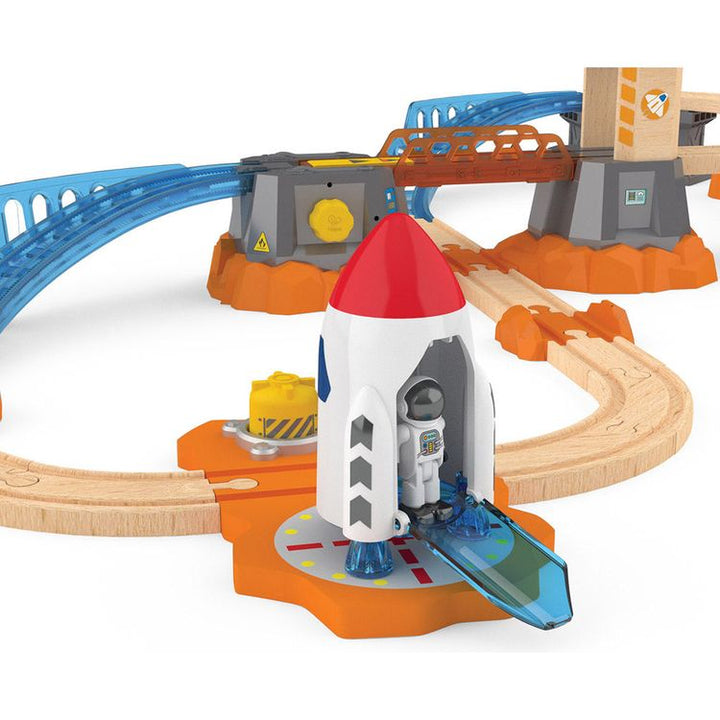 Ground control this is the Mars Launcher speaking! Inspire your mini astronaut as they propel the space train to Mars and explore the red planet with the rover and satellite vehicle. Glow-in-the-dark elements and interactive components enhance imaginative play making it perfect for sparking creativity and cognitive dev