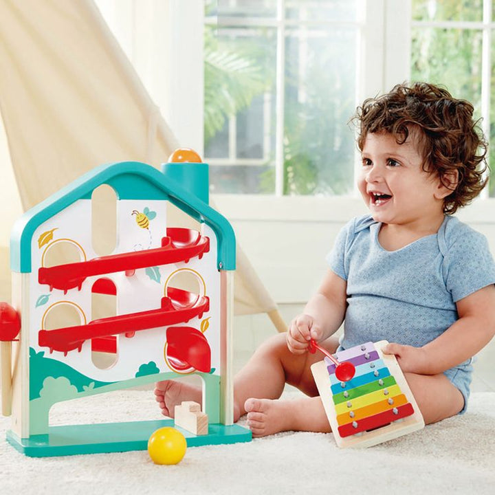 Experience the joy of music and rolling fun with our House-shaped Ball Rolling Game. Navigate the colourful maze, or take out the xylophone board for individual melodic play. LEARNING CAUSE AND EFFECT: Children learn about cause and effect relationships as they observe how their actions like rolling the balls or playin
