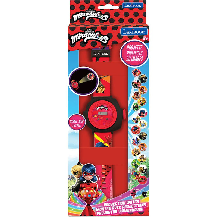 A digital watch with Miraculous design! 20 images of lady bug universe to project wherever you want Communicate with your friends by sending coded messages with your favorite screenings Adjustable strap, perfect for small wrists Rotating ring to choose the image to be projected Time and date display Dimensions: 5.31 x