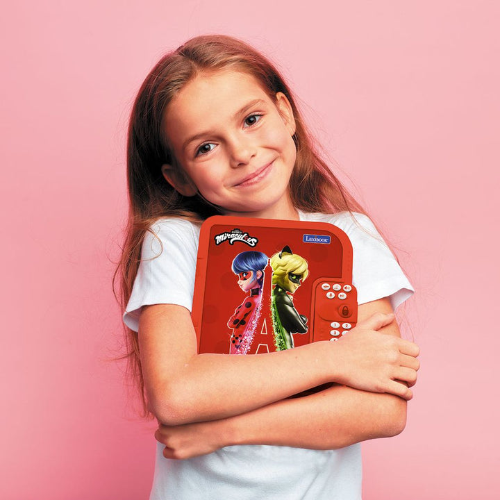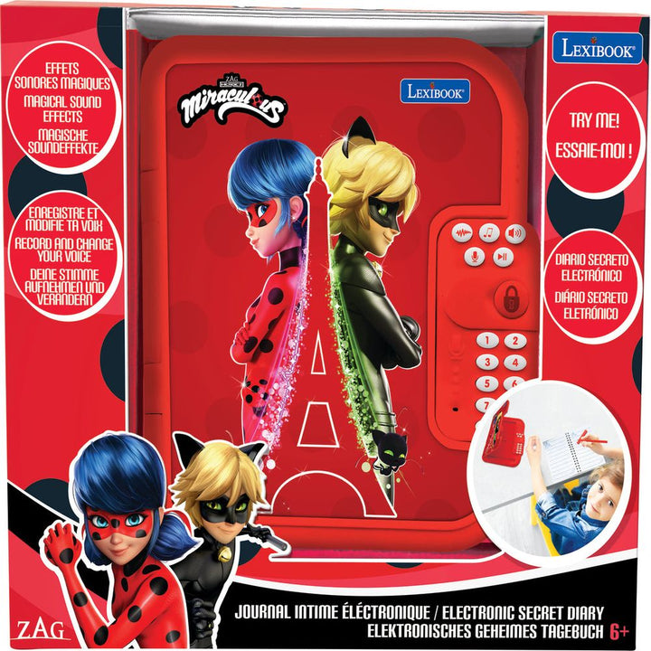 A Miraculous secret safe notebook to write down all your secrets and keep them safe. Create a 4-digit password to unlock the notebook. Fun features: voice recorder, voice changer. Personalise your notebook. A pen included, possibility to change the notebook when you have filled all the pages with your secrets! Dimensio