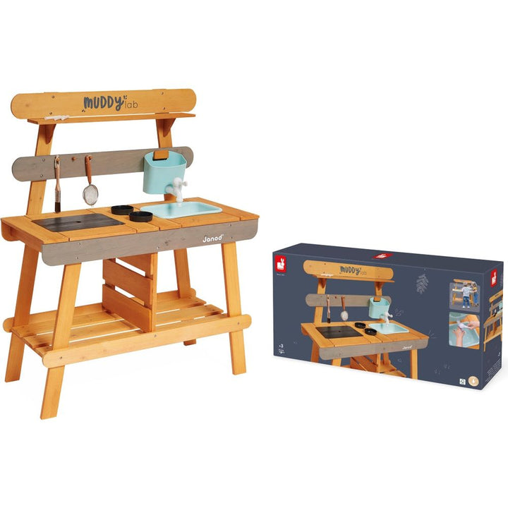 A bit of soil, a few blades of grass, some water, mix it all together, and you have the perfect mud workshop! Let your child thrive in nature and develop their imagination with this solid wood kitchen. Suitable for outdoor use, this toy will withstand all experiments by young and old alike. Delivered with 10 accessorie