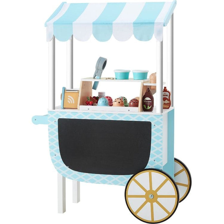 Enjoy summer year-round with the Teamson Kids' My Little Helper Ice Cream Cart. This Robin's egg blue and white cart features a striped awning, rolls on two wheels, and has a pair of sturdy legs for a stable shop. The double-sided design boasts a chalkboard panel on one side and a pretend cash register with a drawer an
