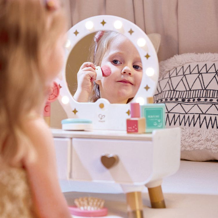 Introduce your child to beauty with this stylish dressing table. Fostering creativity and fine motor skills, children explore makeup artistry, encouraging self-discovery and confidence. This elegant dresser features lights, a mirror, a functional hairdryer, and various makeup pieces that can be neatly stored in the two