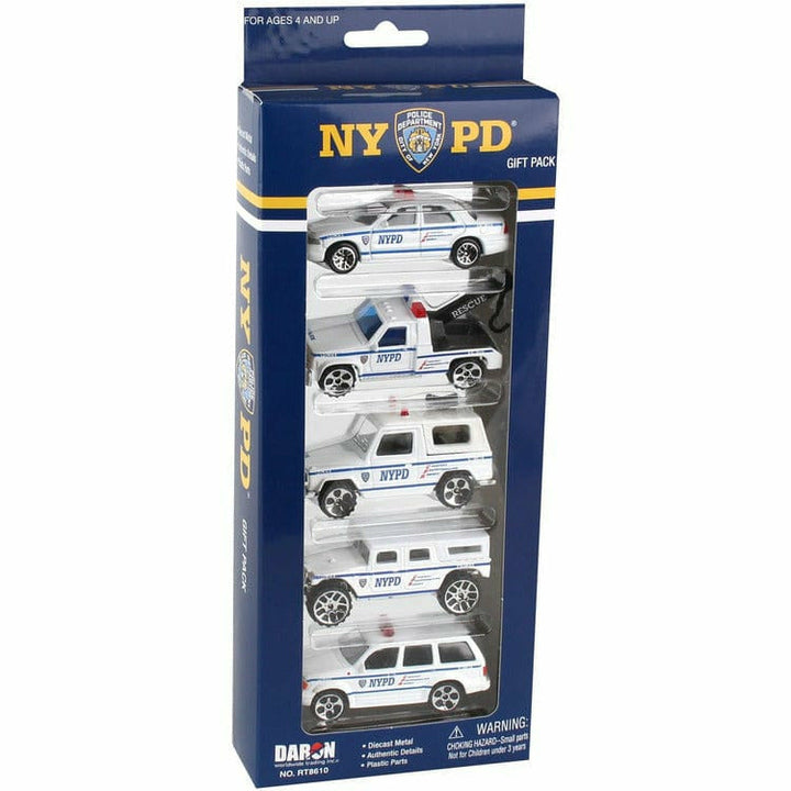Features: The 5 piece die cast New York Police Department pack includes 5 different NYPD vehicles. This NYPD authentic set includes a police car, tow truck, police SUV, operations vehicle and chase vehicle. Each vehicle is approximately 3” long. For children over 3 years