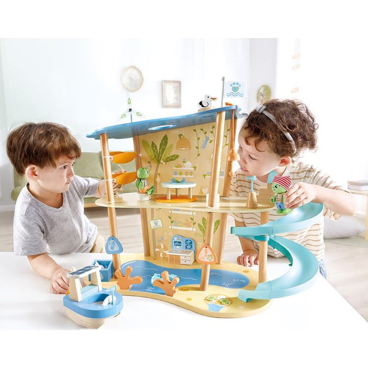Learn how to care for our oceans with this ocean rescue base playset. Including two turtle figurines and five animals, children will help their turtle friends keep the ocean safe and clean and to look after any animals in trouble. The set features two floors to explore with plenty of activities like a spiral slide and
