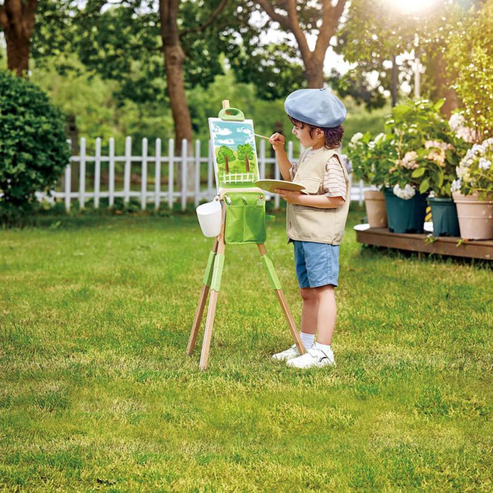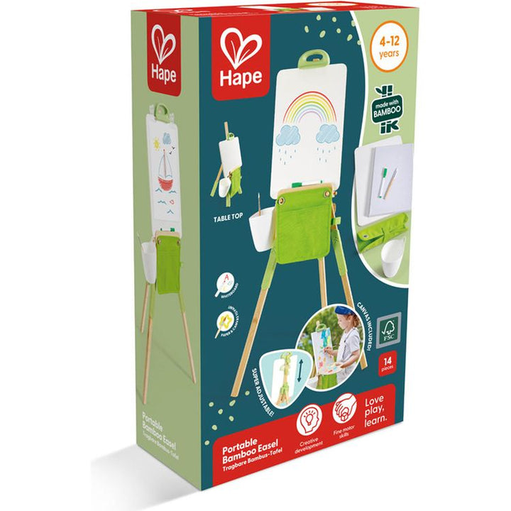 A portable and eco-friendly art companion for young artists. Crafted from sustainable bamboo, it's perfect for creative adventures on the go. PORTABLE ACCESSORIES: This lightweight easel includes the easy-to-assemble bamboo body, three easel leg connectors, one canvas, one wooden drawing board, one foldable brush case,