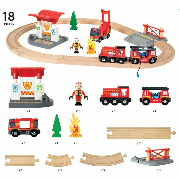 This set includes wooden tracks, a fire train with a fire hose wagon, docking station, firefighter figure, fire truck with light and sound, gateway, wooden tree and fire. BRIO creates innovative, high-quality and well-designed toys with clean, simple designs that spark children's creativity and imagination while encour