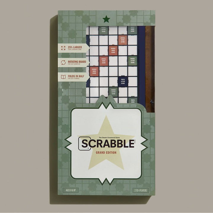 Enhance your next Scrabble match with our Grand Folding Edition. This premium wooden set transforms America’s favorite word game into a beautiful addition to your home. The oversized game board, attractively framed in wood, features a folding, rotating design for convenient gameplay and easy storage. Premium details in