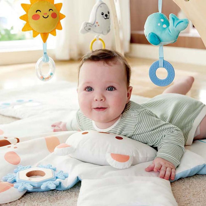 Explore sensory delights with our activity gym. It boasts a soft mirror and customizable cards for budding learners. Additionally, cherish the tummy bear pillow, interactive hanging toys, and crinkly features for comprehensive playtime happiness. Item Weight: 4.85 lbs Product Dimensions (L x W x H): 28.7 x 20.8 x 34.25