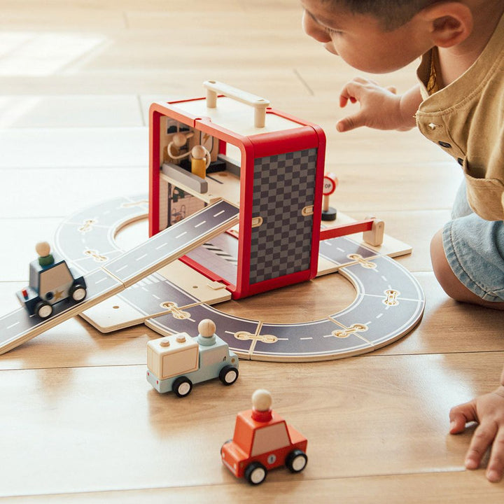 Your kiddos will love our Take with Me Garage. It comes with 12 wooden pieces including cars, trucks, peg people, ramps, signs, charging station and much more. But the best part is kids can pack up all the pieces into the carry along garage and go anywhere. Perfect for car rides, plane rides, or just quiet imaginary