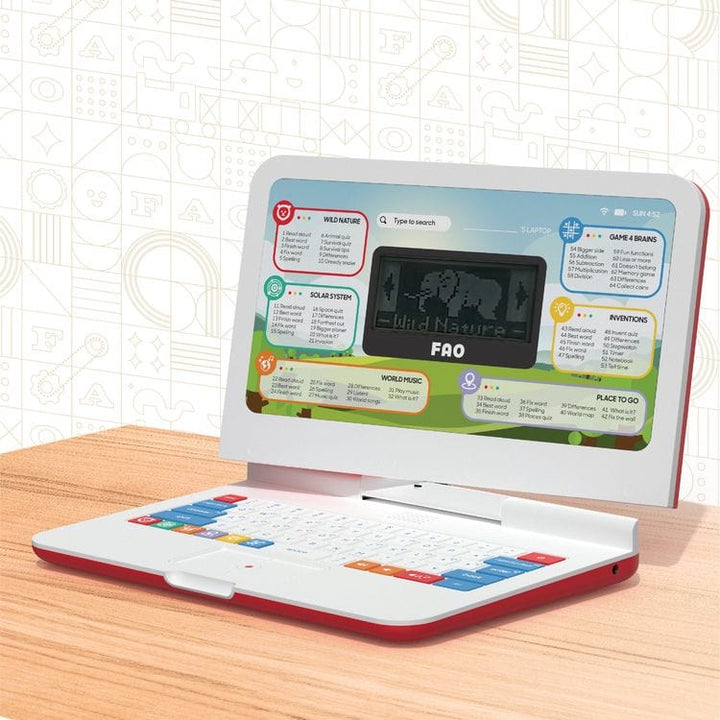 Unlock the world of knowledge for your child with the FAO Schwarz® Teach & Talk Exploration Laptop. This innovative educational device effortlessly transforms from a laptop to a tablet, offering 64 engaging activities that cover key subjects like spelling, mathematics, music, and geography. Ideal for children aged