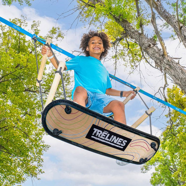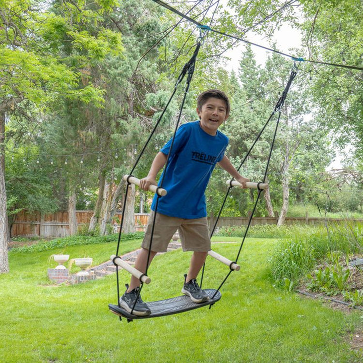 With the Surfin’ Swing, kids can carve through the air, feeling the rush of freedom as they soar higher and higher! Kids can twist, turn, and perform tricks mid-flight, all while suspended from sturdy ropes. Easily set up on Trelines’ Ninja Adventure, Swingset lines, or to a sturdy branch. Weight limit: 250 lbs Ages 5+