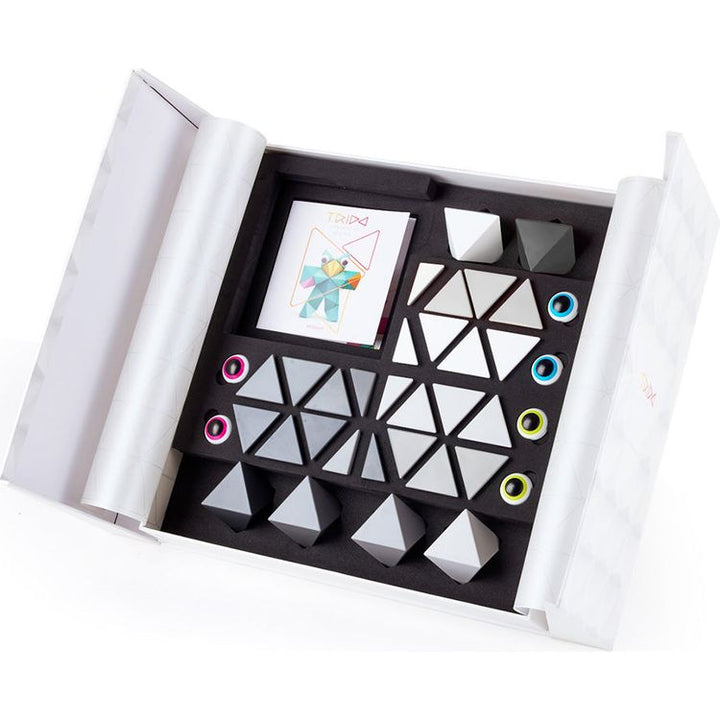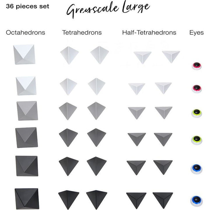 Black, grey and white scale pieces make up the monochromatic set which comes with 36 pieces includes: 6 octahedrons, 12 tetrahedrons, 12 half-tetrahedrons, 6 eyes (in total 36 pieces) + Leaflet + Limited Edition "Inspiration Book" With a large set you can either build one large construction or several smaller ones and