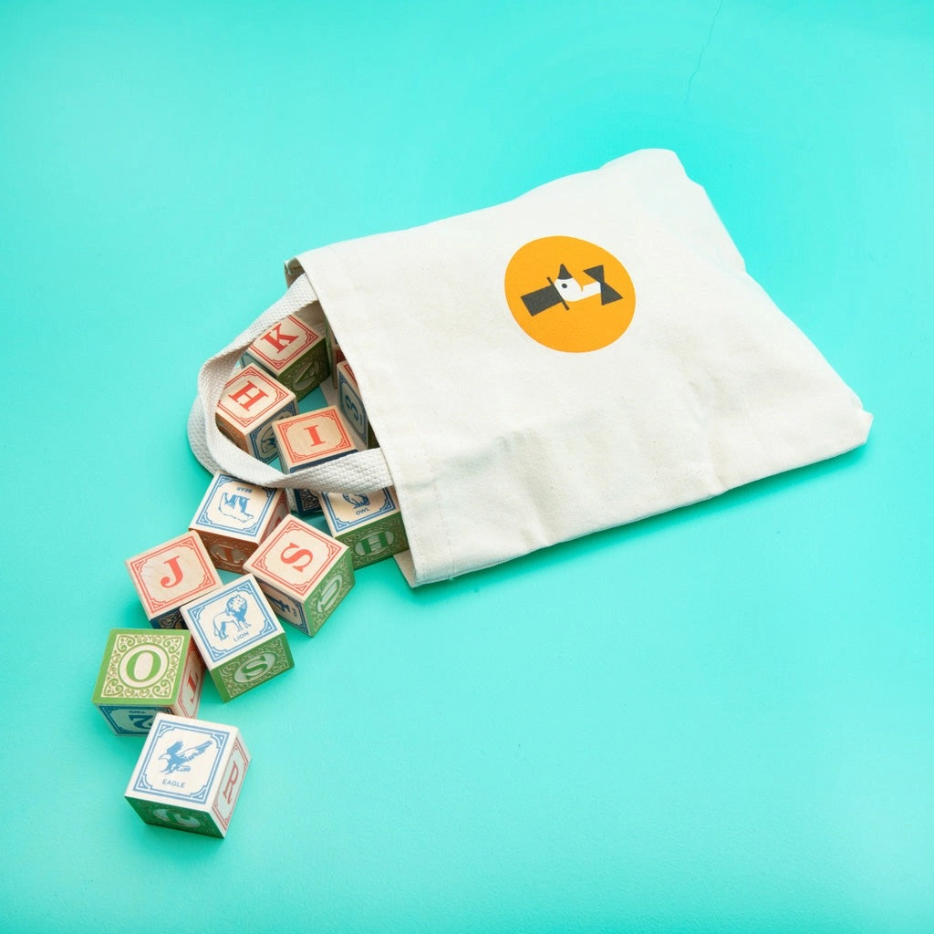 We printed our debonair Uncle Goose logo on a rugged. eco-friendly canvas bag. The Velcro closure makes an oh-so satisfying ripping noise when opened. Designed with ease-of-transport. tidiness. and beauty in mind. Inside the bag. find 28 classic ABC blocks featuring four full alphabets. Add colorful numbers. math symbols. and a menagerie of hand-crafted animals. * 28 – 1.75 inch cubes * Made using sustainable Midwestern basswood * Printed with safe-to-touch inks * 100% made in the USA * Ages 2+