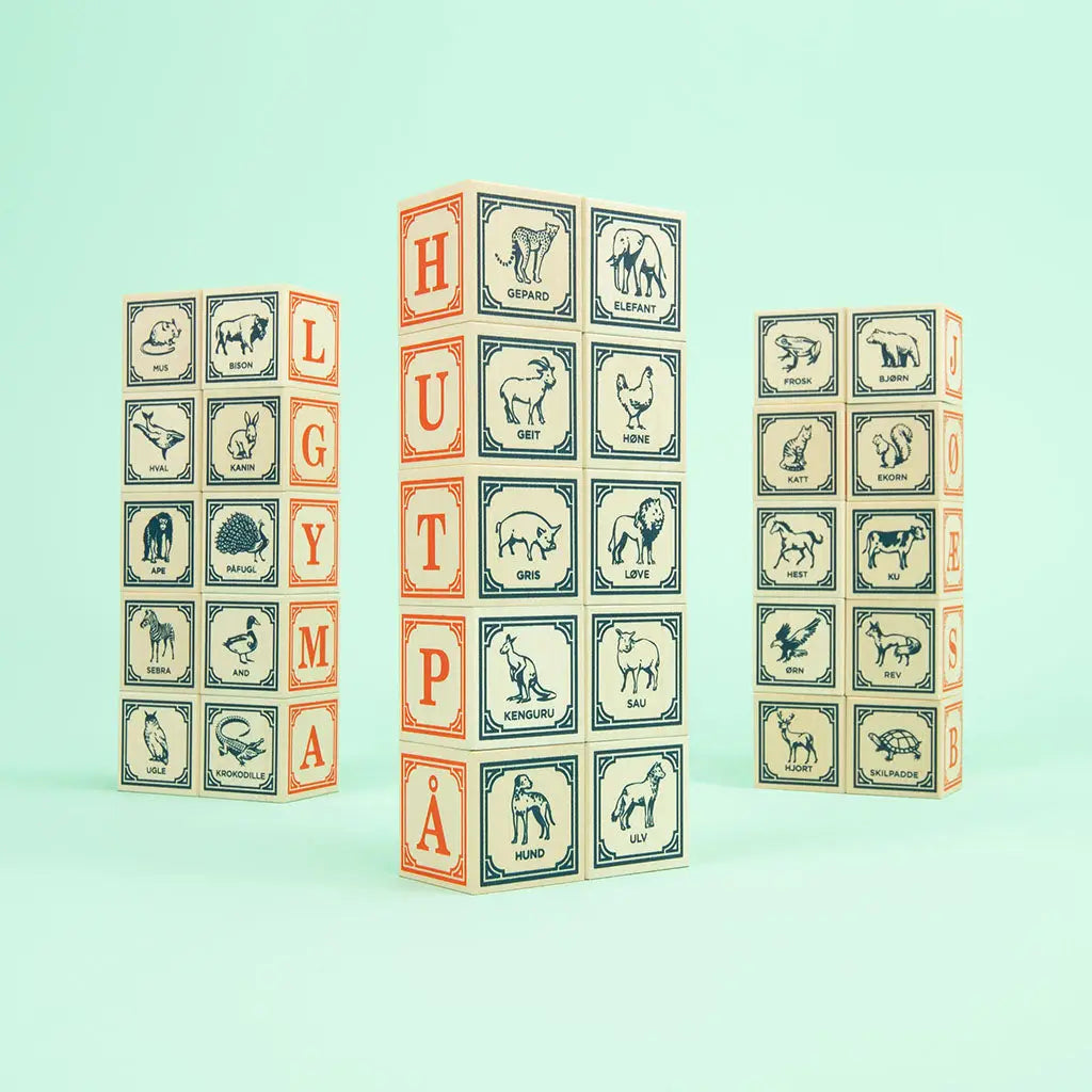 Expand your knowledge of Norway and the Norwegian language. Enjoy the embossed Nordic design elements that surround two letters on each block. Two other sides reveal one number and one animal paired with their Norwegian translations. Two more capital letters make for four complete alphabets in this hand crafted set. Enjoy the traditional color palette. pulled from Norwegian tapestry and artwork. A classic knitting pattern from Norway inspired the snowflake filigree. This filigree is unique to the Norwegian block set.