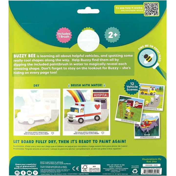 OOLY’s Water Amaze water reveal boards bring helpful vehicles to rumbling, colorful life! 12 reusable reveal boards and a brush are included in this whimsical kit. Learn about shapes while exploring vehicles like buses, helicopters, and boats at work. These illustrations are ready to ignite your kiddo’s creativity with