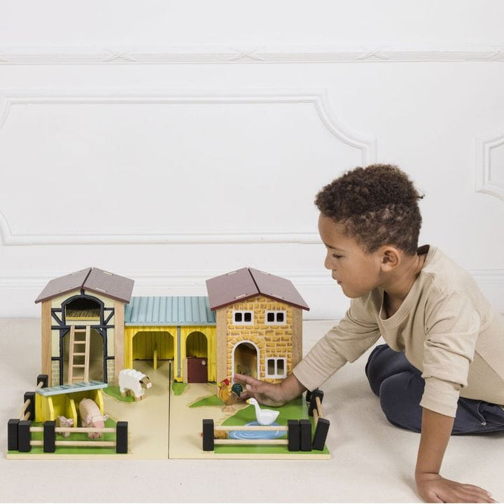 The Classic painted wooden farmyard from LE TOY VAN. The playset includes a large barn with hay loft, a milking parlour, a stable, and a pigsty. Mounted on a detailed decorated baseboard and complete with movable fences. (Scaled to Budkins animals & characters & compatible with standard plastic animals – Anim