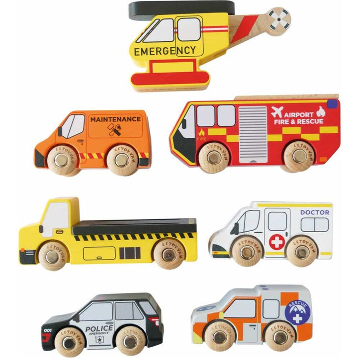 This set of 7 emergency vehicles is a must-have for any little hero. Crafted with highquality wooden wheels, these vehicles are designed to zoom seamlessly on floors or wooden train tracks for endless imaginative play. This highly detailed set includes a rescue helicopter with spinning blades, a mountain rescue van, a
